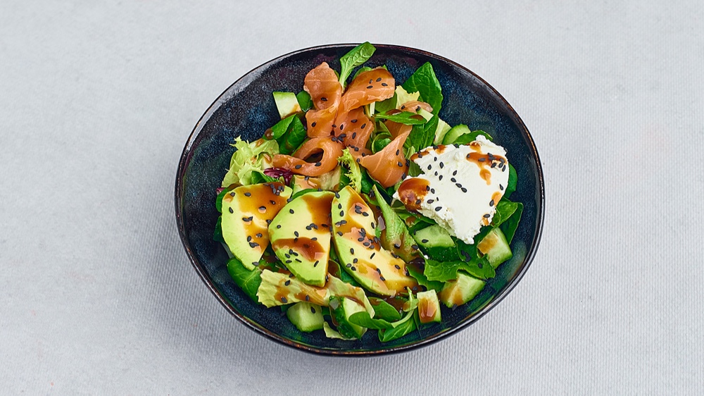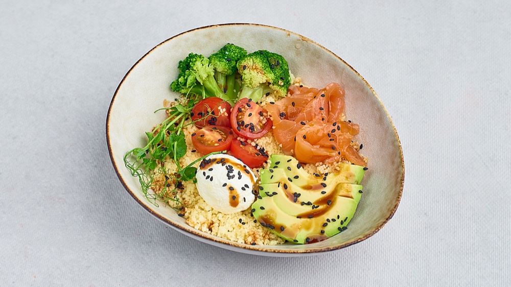 В составе кус-кус, черри, авокадо, брокколи, крем-сыр, соус терияки, лосось, черный кунжут, микрогрин