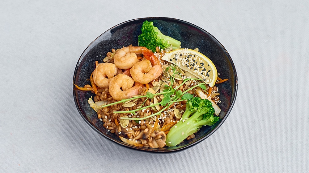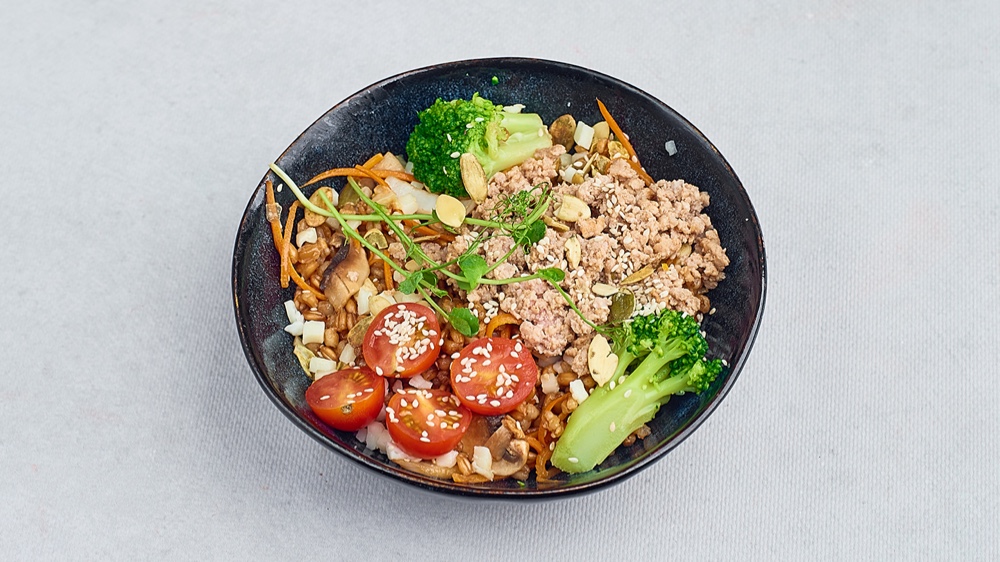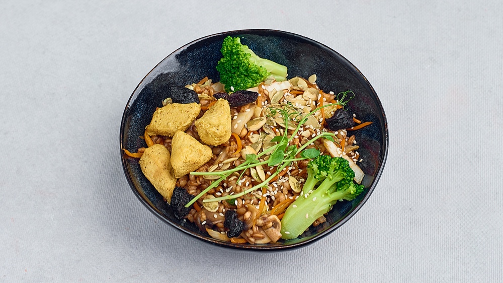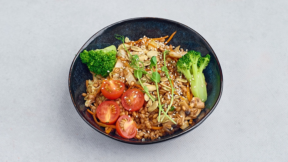 КБЖВ на порцию 314 гр: 274|10,8|9,2|39,2В составе булгур+овес, соус кисло-сладкий, чери, брокколи, шампиньоны, тофу, черный кунжут, микрогрин