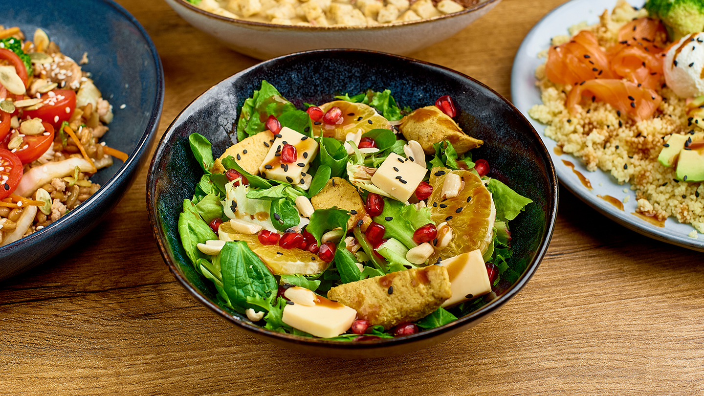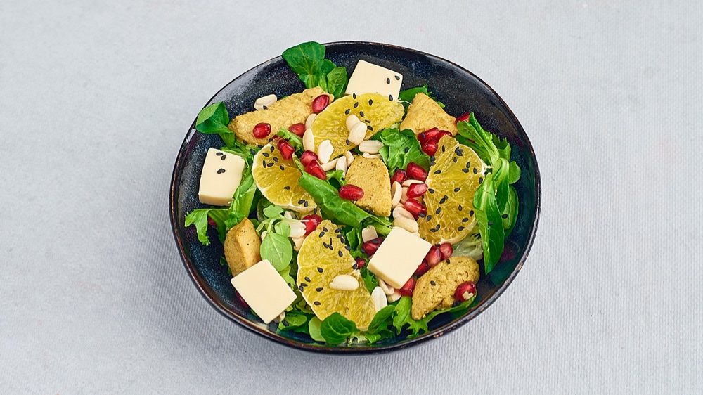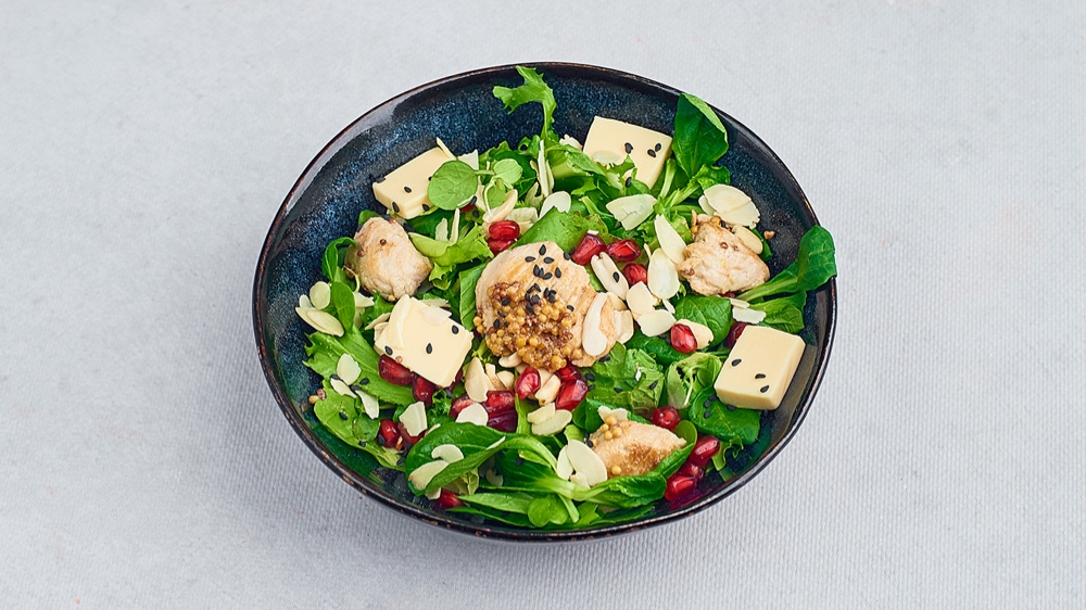 В составе листьев салата, курица карри, апельсин, сливочный сыр, гранат, арахис, медовый соус, черный кунжут