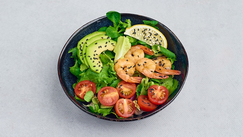 В составе листьев салата, черри, авокадо, креветки, лимон, бальзамический соус, черный кунжут